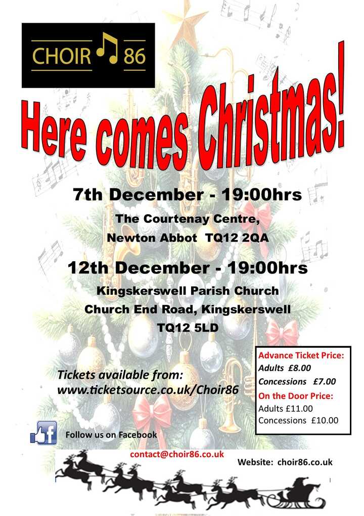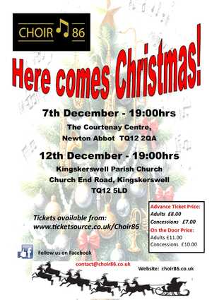 Choir 86 are performing at The Courtenay Centre, Newton Abbot at 7pm on Sunday 7th December 2025. Titled HERE COMES CHRISTMAS it will be a mixture of traditional festive music and other songs that are new to the choir.