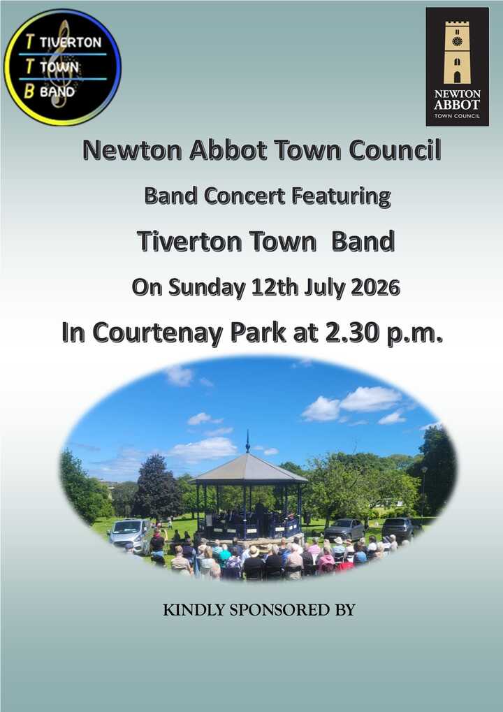 The Tiverton Town Band will be playing in Courtenay Park on Sunday 12th July 2026. The concert will begin at 2.30 p.m.
