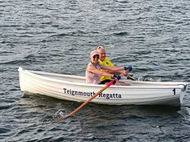 Teams row dinghies more than four miles in relay format, starting at Teignmouth’s Fish Quay with the first half of the team rowing to Coombe Cellars.